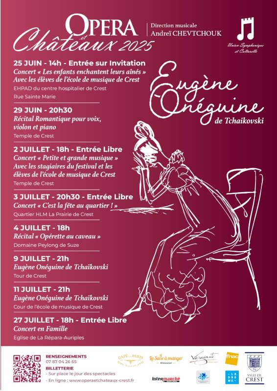 Vendredi 11 juillet à 21h dans la cour de l’école de musique de Crest : deuxième représentation d’Eugène Onéguine de Tchaikovski. Spectacle accessible aux personnes à mobilité réduite.